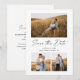Modern Script 3 Foto Bröllop Spara datum-kort. Baksidan innehåller ytterligare information. Klicka på redigeringsknappen för att anpassa denna design med dina foton och bröllopsdetaljer.