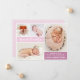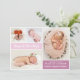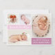 Modern, Girly Rosa Mauve Baby Birth Notice 4 Foto Collage Cards. Ett elegant-stilkort med två sidor av dina favoritfoton på framsidan, med fyra (4) av dina favoritbilder på baby, med ett söt handskript i vitt på pastellblock av mjuk rosa och mauve- eller light lila färg. Lägg till din baby namn på framsidan och födelsetalet. På baksidan finns ett foto av vågrät baby på rosa, vit prickad bakgrund. Du kan lätt anpassa den.