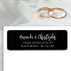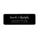 Den här enkla, moderna returadressetiketten för bröllop innehåller parets namn i ett vitt skript för snyggt, med två linjer för adress nedan i ett vitt sans serif-teckensnitt på en svart bakgrund.