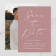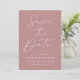 Meddela ditt kommande bröllop i stil med det här trendiget Spara datumkortet med Modern Script Dusty Ro-fotot! Designfunktionerna "Spara datum" som visas i trendigets vita kalligrafi med dammig bakgrund i ro. Anpassa minimalisterna spara datumet med namn, bröllop-datum, plats och bröllop webbplats. Datumet återställs till visning av förlovningen för fullt-utfall i lodrät. Chicen dammiga ro sparar det datum då perfekten valdes för det moderna bröllop.