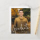 Ett modernt skript-examens kort med enkel design och ett porträttfoto som fyller hela framsidan med namn och examensdetaljer i handskriven font. Baksidan har ett andra foto med ytterligare detaljer. Klicka på redigeringsknappen för att anpassa denna design.