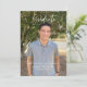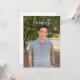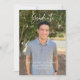 Ett modernt manus för examen foto examensannonsering kort med modernt manus teckensnitt, full bleed porträtt foto på framsidan med namn, klass information och skolinformation. Baksidan har ett andra foto med ytterligare detaljer.
