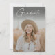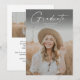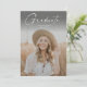 Modern Script Examenfoto Examenfirande Inbjudan. Färgerna kan ändras. Baksidan innehåller ytterligare detaljer och ett andra foto. Klicka på redigeringsknappen för att anpassa denna design med dina foton och text.