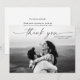 Script foto bröllop elegant stilren modern tackkort. Del av en bröllopssamling. Färgerna kan ändras. Baksidan innehåller ett tackmeddelande som du kan anpassa för varje gäst eller ta bort om du hellre vill skriva ditt tack för hand. Klicka på redigeringsknappen för att anpassa.