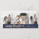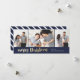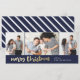 Ett festligt fotokort med guldfärgad God Jul-text med tre foton och en marinblå bakgrund.