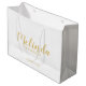Modern Script Personlig Bridesmaids Gift Bag med personlig bridesaid's namn i guld moderna calligraphy font stil med rubrik och bröllop datum i modernt sans serif font stil på vit bakgrund. Även perfekt för Maid of honor, Flower Girl, Budens mamma, Marskalkar, Best Man med mera. Obs! Folidinformationen simuleras i teckningen. Ingen faktisk folie kommer att användas vid skapar av denna produkt.