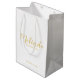 Modern Script Personlig Bridesmaids Gift Bag med personlig bridesaid's namn i guld moderna calligraphy font stil med rubrik och bröllop datum i modernt sans serif font stil på vit bakgrund. Även perfekt för Maid of honor, Flower Girl, Budens mamma, Marskalkar, Best Man med mera. Obs! Folidinformationen simuleras i teckningen. Ingen faktisk folie kommer att användas vid skapar av denna produkt.
