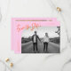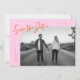 Modern and stylish save the date card featuring a hand lettered script text that says "save the date." One photo in the font and one on the back. The background is orange pink.