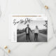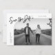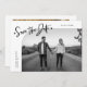 Modern and stylish save the date card featuring a hand lettered script text that says "save the date." One photo in the font and one on the back. The background is white.