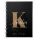 Den moderna svarta anteckningsboken som innehåller ditt första monogram i ett fet och stort guld-teckensnitt och ditt namn i en snyggt-vit kalligrafi namnteckning skript.