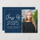 Modern studentfest inbjudan med texten "Klass 2025" i ett vitt handskript på en marin bakgrund. Anpassa studenten inbjudan genom att lägga till foto från student namn, namn och lodrät. Inbjudan återgår till visningen av dina studentfester i vit skrift på marin bakgrund.
