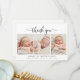 Elegant Modern Calligraphy Script 3 Photo Collage Newborn Baby Tack Birth Announcement Card. Har en vacker "tack"-text i ett handskrivet calligraphy swash svan-teckensnittsskript. Personligt budskap och födelsestatistik som i förväg utarbetats tillsammans med baby namn ingår i svart och vitt. Underbar för pojke eller flicka. Enkel att anpassa med ditt baby-foto och din information.