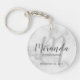 Lägg till en personlig beröring till bröllop med personlig bridesmaid-nyckelkedja. Den här nyckelkedjan har personlig bridesaids namn i det moderna skriptteckensnittet stil och monogram i det lätta grått moderna typsnittet stil som bakgrund med titel och bröllop datum i grått modern sans serif font grått på vit marble-bakgrund. Även perfekt för maid of honor, budens mamma och mer. Observera att marmordetaljer simuleras i teckningen. Ingen egentlig marmor kommer att användas i produktens skapar.