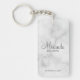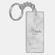 Lägg till en personlig beröring till bröllop med personlig bridesmaid-nyckelkedja. Den här nyckelkedjan har personlig bridesaid namn i det moderna skriptteckensnittet grått stil med rubrik och bröllop datum i grått modern sans serif font stil på vit marble-bakgrund. Även perfekt för maid of honor, budens mamma och mer. Observera att marmordetaljer simuleras i teckningen. Ingen egentlig marmor kommer att användas i produktens skapar.