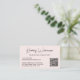 Professional light pink business card featuring your name showcased in a chic modern script and your title and contact information (such as email, telephone numbers, firm name and mailing address) in clean, simple lettering. Input a URL address to create a scannable QR code linked to your website, social media profile, or other platform that showcases your work, making it easy for others to explore your expertise. Add additional text on the back or leave blank.