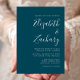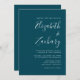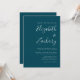 Den här enkla moderna bröllopsinbjudan innehåller vit text på en tealblå bakgrund. Lägg till bildens och bildens namn i snyggtens handskriftsgrafi och detaljerna i sans serif-teckensnitt. Den omvända sidan är en matchande ton av solid teal.