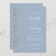 Den här elegantens lämnat kant har en modern bröllopsinbjudan i silver i glitter. Anpassadet kombinerar vit handskrift, tryckplåt och kursivt typsnitt på en dammig blå bakgrund. Den omvända sidan ger plats för bröllop-information på en solid dammblå bakgrund, tillsammans med en QR-kodgäst som kan besöka webbplatsen och OSAN, vilket sparar kostnaderna för utskrift och utskick av separat OSA kort.
