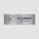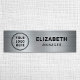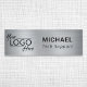 Modern namnskylt med din verksamhet eller organisations logotyp mot en silverfärgad metallisk bakgrund. Lägg till ett namn och titel i enkel typografi.