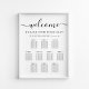 Modern hämtningsbar sittplatsplan för bröllop poster för upp till 10 bord med "välkomstskript" i ett chic med dekortecken, "Hitta ditt säte", datum för namn och bröllop i elegant-serif-typografi, och bordsnummer och gästnamn i enkel typografi. Välj det digitala nedladdningsalternativet om du vill redigera med ändringar i sista minuten och skriva ut lokalt.