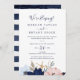 Denna moderna sjöfartsinbjudan till vigselmottagning med blommor är perfekt för en kryssning eller strandfest efter vigseln. Den fantasifulla designen har rosa och marinblå akvarellblommor med guldstjärnaccents, vilket ger den en strandig känsla. RSVP-kort säljs separat, eller så kan du lägga till RSVP-information på baksidan av kortet.
