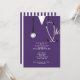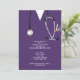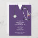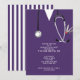 Kreativets sjuksköterskeskola i studenten inbjudan, med lila sjukhusskrubbar och vårdutrustning.