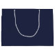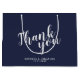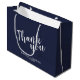 Modern Script Navy Blue Wedding Favor Gift Bag med titeln "Tack" i vitt, modernt skript med namn och datum i modernt sans serif-teckensnitt på marin blå bakgrund.