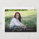 Denna moderna examensfestinbjudan har ett horisontellt foto som fyller hela framsidan av kortet och ett andra urblekt foto på baksidan. Modern handskriven skrift visas över fotot som lyder '26 examen. Anpassad text låter dig lägga till examen namnet och skolan på framsidan och festinbjudan på baksidan.