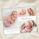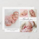 Modern Elegant Kalligrafi Skript 4 Foto Collage Baby Flicka Tack Kort. Innehåller ett vackert handskrivet kalligrafi tack svans typsnitt skript och ditt personliga meddelande. Lätt att anpassa med dina bebisfoton och detaljer.