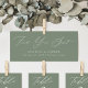 Elegant bröllop-sätesdiagramhuvud med frasen "Hitta ditt säte" som visas i ett modernt, vitt kalligrafiskt skript med sidbakgrund med grönt. Anpassa sidhuvudets namn, bröllop-datum och bröllop-plats för gröntens sätesdiagram. Utformningen koordinerar med vår Modern Elegance bröllop-samling.