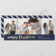 Ett festive-fotokort med guld god jul-skript med tre foton och en marin blå bakgrund.