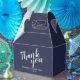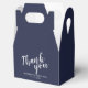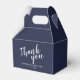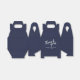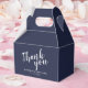 Den moderna typsnittet "Tack" i det moderna skript-typsnittet ord med namn och datum i det moderna sans serif-typsnittet på marin blå bakgrund.