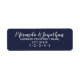 Modern Blåbröllopssviten för marktunga skript : Returadressetikett med brid och namn i vitt modernt skript med adress i vitt modernt sans serif-teckensnitt på marin blå bakgrund.
