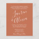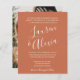 Modern budgetinbjudan för fotobröllop - innehåller Brides och Grooms namn, stor och djärv i modern, skripttypografi. Baksidan av inbjudan har ett vackert foto av bruden och brudgummen. Inbjudan kommer att ingå i en bröllop-svit och kommer att finnas tillgänglig i olika färg. Du kan enkelt ändra bakgrunden till färg så att den matchar bröllop-temat. I teracotta. En enkel, klassisk inbjudan med söt kalligrafi. * Observera att detta är ett budgetalternativ. Fotot kommer definitivt att bli bättre på vår platta inbjudan. Om du vill ha ett tjockare och bättre pappert lagrar, välj vår platta inbjudan. Vi rekommenderar INTE att du väljer satsalternativet för budgetinbjudan. Designad av Beverly Bainbridge Homespun Cottage Designing E: homespuncottagedesigns@gmail.com