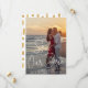 Med det moderna fotot sparar du datumkortet med ditt fullt utfall lodrät bild med ett textöverlägg med ord, "Spara our Date" i ett tunt, vitt handskriftsteckensnitt. Nedan följer två linjer text för er bröllop-information. Baksidan har guld och vit abstrakt mönster och kan tas bort genom att klicka på knappen "anpassa". En enkel men ändå elegant utformning som gör fotot till huvudfunktionen.