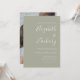 Den här enkla, moderna bröllopsinbjudan innehåller vit text på en sidas grönt bakgrund. Lägg till bildens och bildens namn i snyggtens handskriftsgrafi och detaljerna i sans serif-teckensnitt. Byt enkelt ut exempelbilden på baksidan mot ett eget foto.
