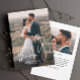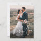 Ett Modern skript Simple Bröllop Photo Tack You Card med handskrivet teckensnitt med utfallsfoto porträtt på framsidan med namn och bröllop. Baksidan har ett andra foto med ett tackmeddelande från de nya länkarna. Klicka på knappen Redigera om du vill anpassa designen.