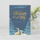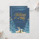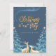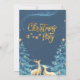En förtrollande julfestinbjudan med en djupblå natthimmel fylld med skimrande stjärnor och ett magiskt, virvlande sken. Guldtext lyder "Julparty", accentuerat med ömtåliga hängande stjärnor, medan två eleganta gyllene renar ser uppåt. Snötäckta granar inramar scenen och förstärker den mysiga, festliga atmosfären. Denna design inger en känsla av undran, värme och julglädje, perfekt för att inbjuda gäster till en minnesvärd julfirande.