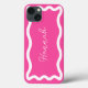 Modern snyggt monogram iphone case med shock rosa vågigt stil gräns. Anpassat namn för handskrivet stil-skript för snyggt. Välj från knappt där eller tuff stil caseser och skydda din iPhone i stil.