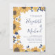 Ljusstark och rolig inbjudan till ett modernt bröllop med solblommor, blommigtar och marinblått blad, ditt första namn i ett stort blått skript för snyggten och detaljerna i enkel marin blå typografi.