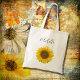 Modern personlig gul solros blommande tote-handväska, med anpassningsbar svart script-typografi. Njut av denna eleganta accessoar för daglig användning eller som en present till någon speciell.