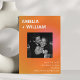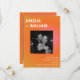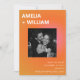 Denna bröllops-karta för att spara datum kombinerar en djärv orange och rosa solnedgångsgradient med ett naturligt engagemangsfoto för ett modernt och energiskt tillkännagivande. Framsidan har en stark typografisk layout med ert foto centrerat, medan baksidan har plats för en andra bild för en hel berättelse. Den rena designen och den livfulla sommarpaletten känns självsäker, stilren och otvungen modern. Ett vackert val för par som planerar ett bröllop i staden, takfirande eller modern sommarfest.