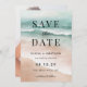 Modern sommar strand hav bröllop Spara datum - det perfekta sättet att tillkännage ditt bröllopsdatum till din familj och vänner. En vacker sandstrand med blå havsvågor. Inbjudan innehåller också ditt favoritfoto.