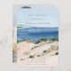 Modern sommarhavsstrand bröllop spara datum har en vacker akvarell strandlandskap med modern typografi för en minimalistisk känsla. All text är redigerbar. Ditt favoritfoto visas på baksidan av inbjudan.