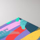 Den här färgfulla konsten på arbetsytans vägg har abstrakt i ett färg-block stil i blått, lila, orange, gult, rosa, rött och grönt med marin blå bakgrund och roligt-dockformer som blommor, löv, cirklar, fyrkanter och prickar