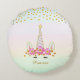 Söt enhörning med blommor & guldconfetti på pastellfärgad bakgrund Rund kudde. Namn kan anpassas. Perfekt som en present!