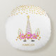 Modern, söt enhörning, blommor & guldconfetti rund kudde