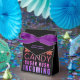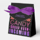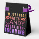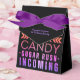 Rolig och modern present för Halloween. Grafiken säger "Jag är bara här för godis, sockerkick på ingång" i nyanser av orange, rosa och lila. Denna presentlåda kan personanpassas på främre klaffen.