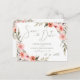 Modern postkort för Bröllop spara datum-meddelande med foto. Vacker, handmålad vattenfärg, asymmetrisk andedräkt av blommar från ro i korall och rosa med botaniska trädgårdsgrejer. Trendigets handskrivna typografi med enkel redigering av mallens fält. Redigerbar kopia, teckensnittsval, layout och färg kan ändras beroende på stil och smak.