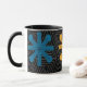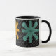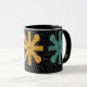 Mugg har en modern utformning av stjärnsprängningar i färg på svarta fält i mitten av århundradet.