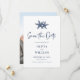 Det här moderna minsta badbröllopet på stranden sparar datumkortet med en vit bakgrund med marin blå text, två stjärnfiskar överst och trendig handskriftskript kalligrafi, med en fotomall på baksidan.